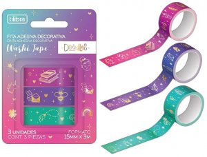 A Fita Adesiva Washi Tape é fácil e prática de usar, ideal para ser usada em qualquer tipo de superfície lisa para enfeitar e personalizar objetos, além de ter um design divertido e personalizado. A Washi Tape é uma fita decorada que pode ser utilizada para marcar títulos nos estudos ou para decorar objetos, como: lápis, cadernos, agendas entre outros. A linha Doodles é composta por 3 Washi Tapes com acabamento em hotstamping em dourado. Caracteristicas: • Fita adesiva decorativa; • Acompanha 3 rolos; • Tamanho do rolinho 15mm X 3mt.