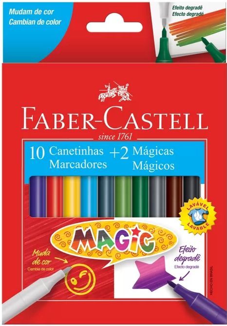 CANETINHA HIDROGRAFICA - CANETINHA HIDROCOR - CANETINHA HIDROGRÁFICA - CANETA HIDROCOR - LAVÁVEL - CANETA HIDROCOR FABER CASTELL MAGIC 10 CORES + 2 MÁGICAS - Cores: Preto, azul claro, azul, verde claro, verde, amarelo, laranja, rosa, roxo, vermelho e 2 brancas - As canetinhas possibilitam criar um efeito degradê ao usar a canetinha mágica em cima das cores utilizadas.
