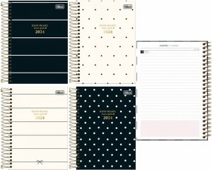Detalhes: Bolsa: de papel decorada, Capa: dura, Capa acabamento: com detalhe metalizado, Espiral: colorido, Folha de adesivos, Folhas: decoradas, Parte interna da capa decorada, Produto certificado: FSC, Visão: diária exceto sábado e domingo, Gramatura: 63 g/m², Número de folhas: 176 folhas.